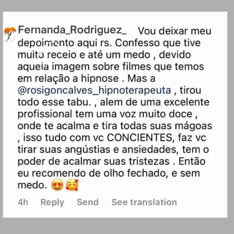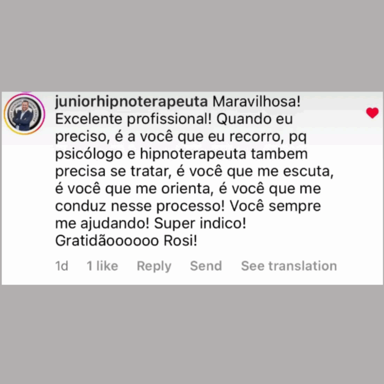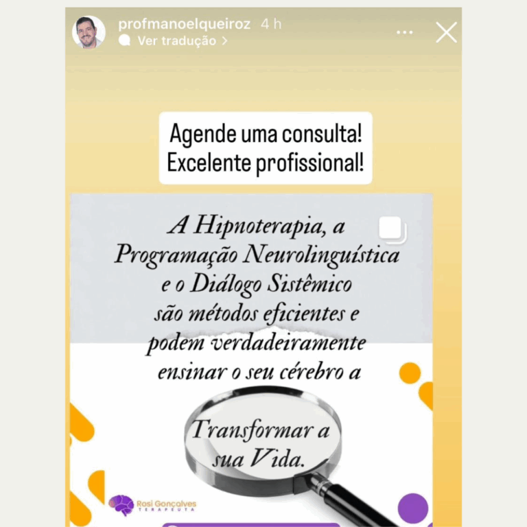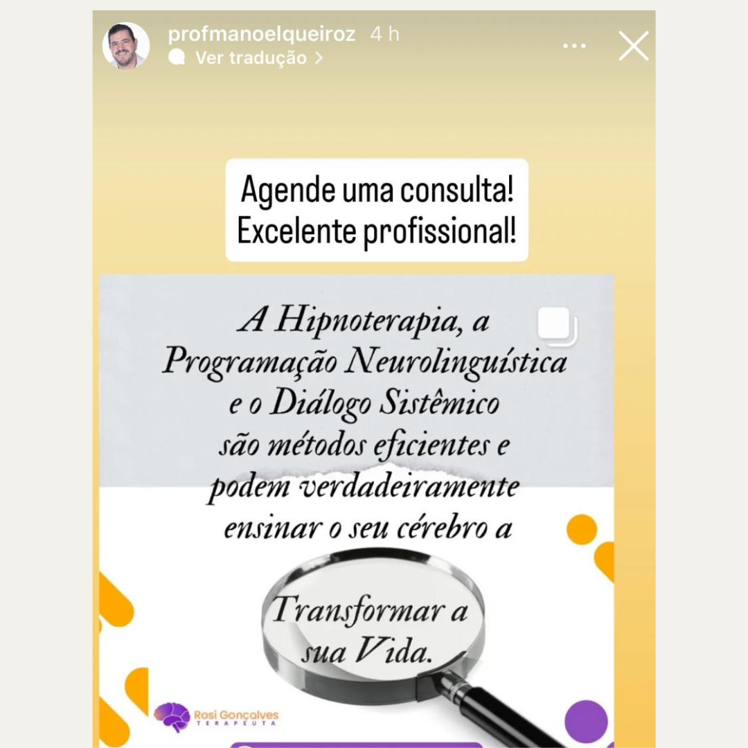 A Hipnoterapia é um processo terapêutico que utiliza o estado natural de foco e concentração da mente para acessar recursos internos e promover mudanças profundas. Diferente da crença de senso comum de “perder o controle”, a Hipnoterapia, na verdade, amplia a consciência e ajuda a enxergar além dos padrões repetitivos que geram ansiedade, medos, sofrimento e dores emocionais, além do desequilíbrio em diferentes áreas da vida. Se você deseja superar bloqueios, resolver traumas e descobrir a raiz do seu problema, agende a sua sessão agora e dê o primeiro passo para a sua transformação.